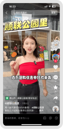 顺联公园里地处广佛都市圈核心区域,辐射佛山禅城、南海、顺德和广州荔湾、荔湾五大区域。通过抖音探店,实探形式拉动区域口碑声量与到店流量,吸引周边消费者打卡消费。